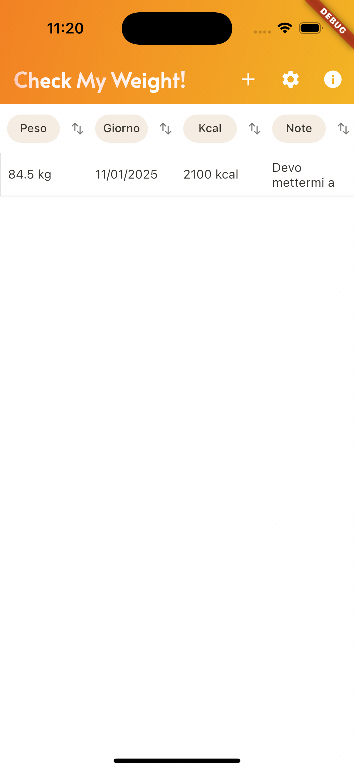 - Ordina i tuoi dati per peso, giorno, calorie e note per un rapido confronto.